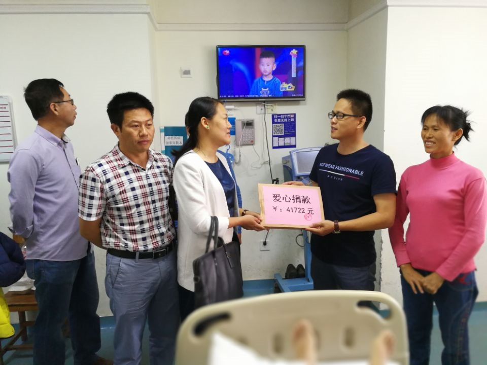 接到報告后,綠港集團(tuán)工會黃麗琴主席立即向集團(tuán)公司董事長、總經(jīng)理龔國強(qiáng)匯報這起意外事件。龔國強(qiáng)董事長指示馬上安排人員前往梧州慰問,了解病情。同時,向經(jīng)開區(qū)有關(guān)部門報告,并向經(jīng)開區(qū)和集團(tuán)公司職工發(fā)出捐款倡議,籌措愛心救助款,給吳海有家人最大的幫助!