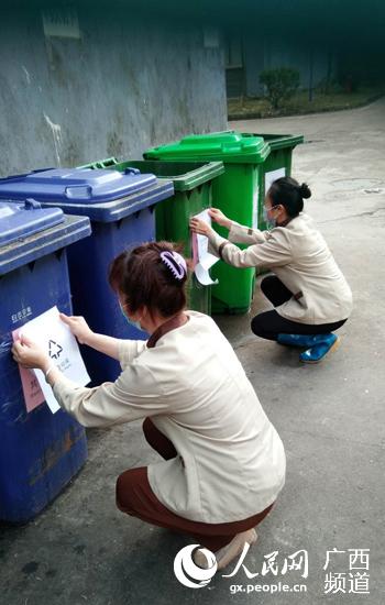 綠港集團物業(yè)員工張貼垃圾分類標識。朱春生攝